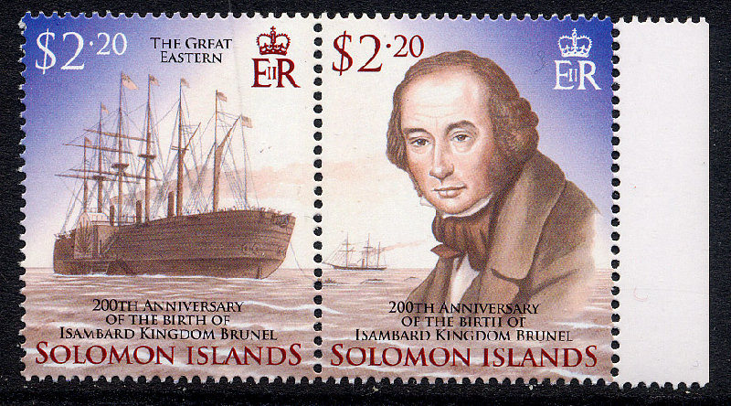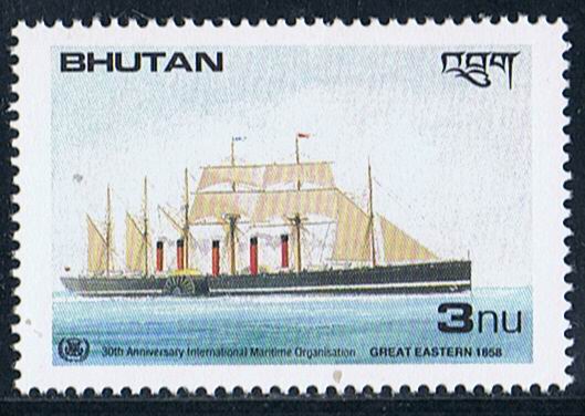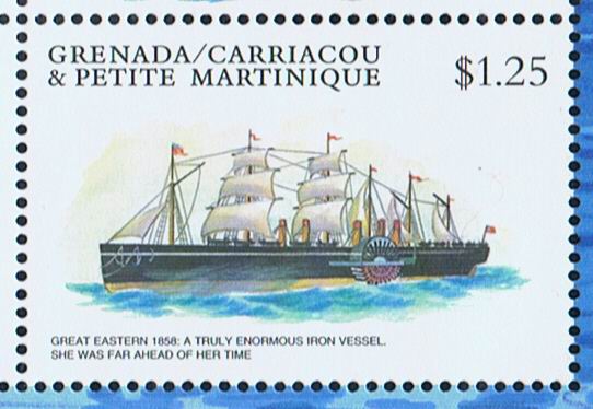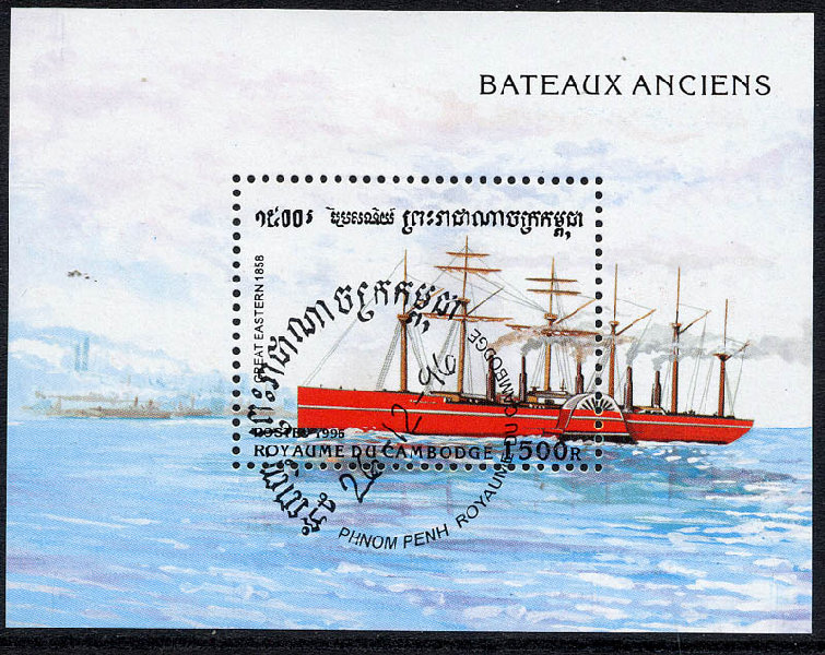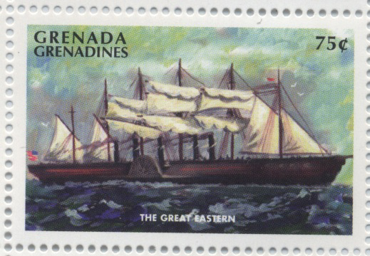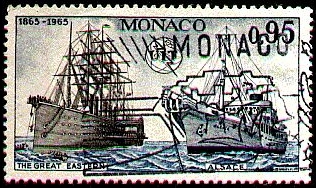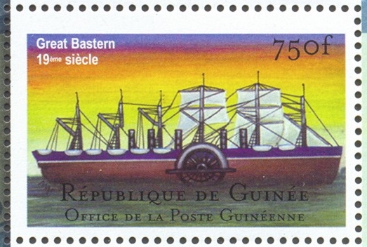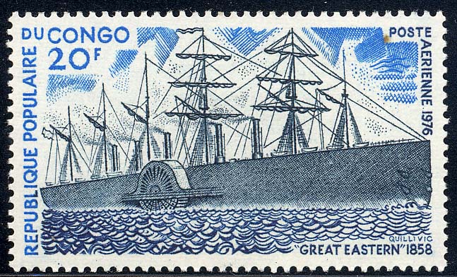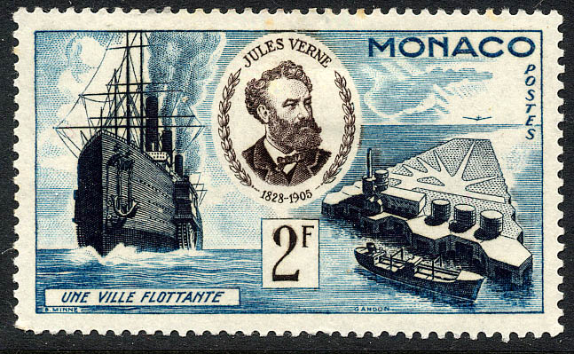 Literal translation of the caption of this Jules Verne stamp is "A floating town", and it would seem probable that the ship depicted is the famous paddler Great Eastern. She was built during the French writers lifetime and may well have stirred his creative imagination. For many years she was used as a standard of comparison when speaking of size. "Half as big as the Great Eastern" with variations, became a common phrase. In weight she surpassed the total tonnage of the three next largest steamers in the world, and for about 40 years she was the longest ship afloat. Designed by I. K, Brunel and J. Scott Russell she was built on the River Thames at Blackwall, her owners being the Eastern Steam Navigation Company. In 1860 she made a voyage to New York, and in later years she was employed on cable laying operations.