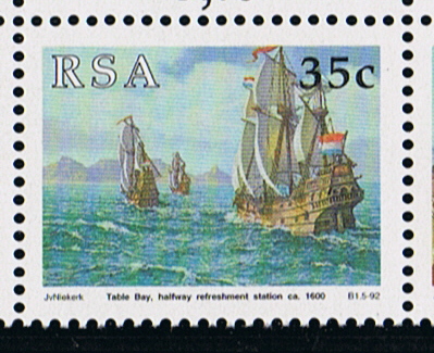 One the first stamp, three Dutch merchantmen are show under full sail near Cape of Good Hope, with in the background Lion’s Head, Table Mountain and Signal Hill, since immemorial times the characteristic landmarks for travellers to the Cape.
