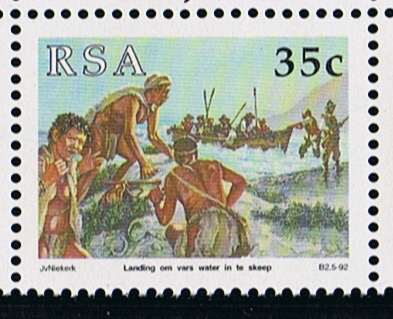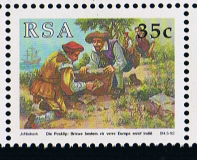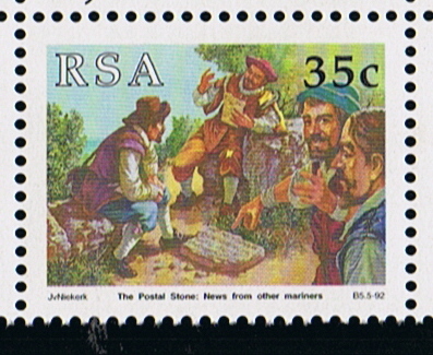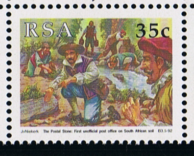 The stones with the inscription were usually left on the beach near the mouth of the freshwater river Versse Rivier (now Liesbeek River), this is displayed on the second and third stamp, it shows the Khoekhoe men and a group of sailors with a postal stone, in the background of the third stamp the sailors are drinking from the river and carry water.