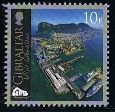 The 44p value shows an aerial photograph looking from south to north and showing the whole of Gibraltar from Europa Point. Visible are Europa Point Lighthouse and the port of Gibraltar.