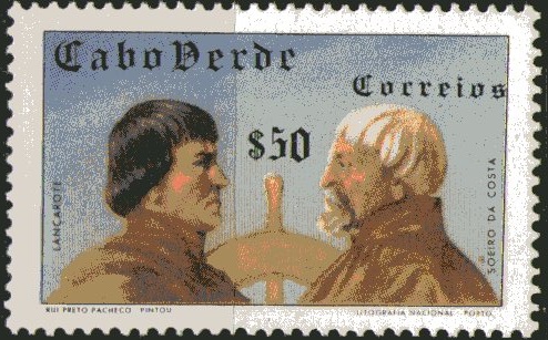 Soeiro da Costa(on the stamp to the right)is Portuguese navigator 15c, participated in the discovery of the coast of Africa and in the slave trade. In 1446 Commercial "Lagos Company" sends a massive fleet of fourteen vessels for slave raid on Arguin Bank . Haded by squadron Lançarote de Freitas. One of the captains squadron was Soeiro da Costa (Alcaide Lagos Lançarote and father-in-law) .After an unsuccessful raid Soeiro da Costa results of the squadron of four or five caravels from Arguin back to Lagos. Dissatisfied with the profit of this trip, Costa makes a quick stop at Cape Blanc, where he grabs a woman berberov.On believes he can buy out of. Arguin for more than slaves. Costa passes the rest of the ships themselves, while he himself returned to the shores of Arguin to seek redemption. But the voyage proves fruitless and Soeiro da Costa eventually returned to Lagos by itself. (More about the slave raid see “Lançarote de Freitas”). 1461 ships expedition Peru di Sintra, one of which was commanded Soeiro da Costa, rounded Cape Palmas (4 degrees south latitude) and entered the waters of the Gulf of Guinea. 1470 Soeiro da Costa, a former companion of Pedro de Sintra, located on the border between Liberia and Côte d'Ivoire, where found, that the coast turns finally to the east. In the vicinity of Cape "Three Points» Soeiro came into the coasts of modern Ghana, which because of its wealth of gold called "Gold Coast" .Byl in the early colonial period, as indeed all the Guinean coast are named after their main commercial products.