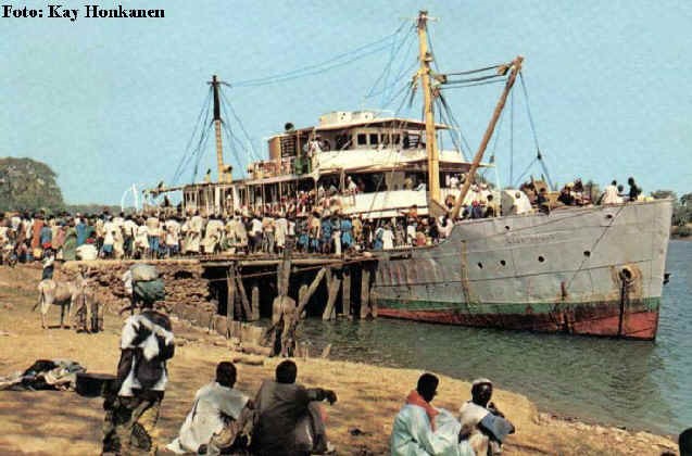 The Lady Wright maintains a passenger and cargo service, alternating with the Fulladu, between Bathurst and Basse with occasional extended voyages to Fattoto. Basse is 242 miles inland from Bathurst and Fattoto 288 miles. The present schedule calls for these vessels to depart from Bathurst at 1800 hours on alternate Mondays, calling at approximately 20 river ports en route, in each direction. This is of course varied as inducement offers. Each vessel has aboard a travelling post office for the service of river ports, (the only remaining service of its kind). The river trip is an enjoyable experience and is used by tourists as well as officials and other businessmen.