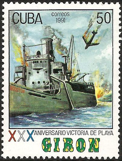 The Cuban 3c, stamp of 1966, commemorating the fifth anniversary of the Battle of Giron, shows a scene from an ill-fated revolt against the present Castro regime. A number of Cuban exiles had planned for some years to overthrow the Cuban Government and they decided to invade Cuba by sea and air, and with the help of resident sympathisers in Cuba, to start a full-scale revolt against Castro. The troops in exile were mainly trained in Guatemala, and at the appointed time were assembled at Puerto Cabeza in Nicaragua, where they embarked with all their equipment and ammunition in the transport ships.