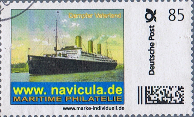 The vessel depict on the stamp is given as VATERLAND but the funnel colours are more the colours of the United State Lines.
