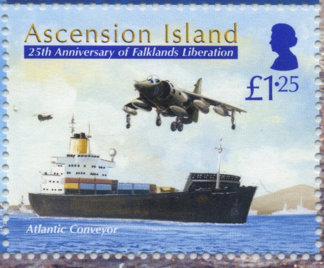 25 April1982 she sailed for the Ascension Islands under command of Capt. Ian North, with on board 5 Chinook and 6 Wessex helicopters. On arrival at Ascension she got 8 Fleet Air Arm Sea Harriers and 6 RAF Harrier GR.3 jump jets, while one Chinook helicopter was removed for maintenance.