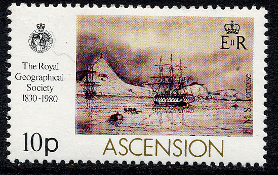 IN 1850 it was said that Edward Hodges Cree was on HMS FURY whilst it was in the waters off Ascension Island. He is supposed to have made the panoramic painting of the Island and the TORTOISE anchored offshore. The stamp is designed after this painting; in the background of the stamp you can see an other vessel, which till so far not is identified.