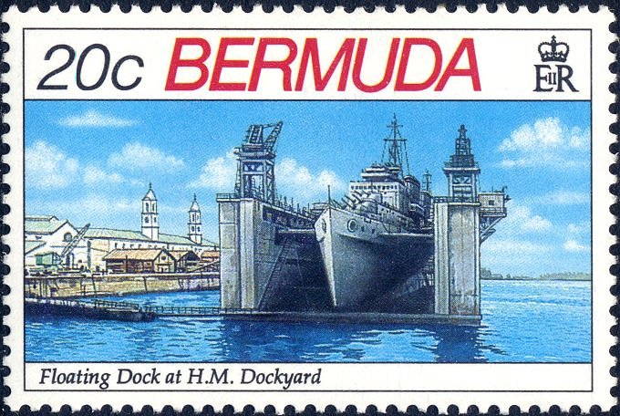 This stamp shows HMS ARGONAUT in the floating dock at Bermuda.