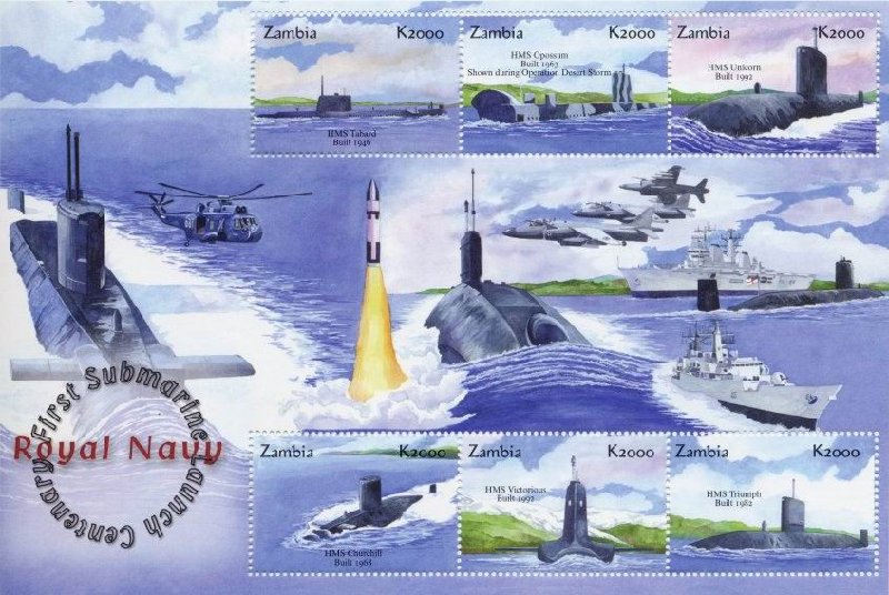 In 2001 Zambia issued a miniature sheet to commemorate the Centenary of the Royal Navy Submarine Service. There are 6 stamps showing submarines and in the margins are 3 more submarines, an aircraft carrier and a frigate – No 85. This corresponds to HMS CUMBERLAND F 85.