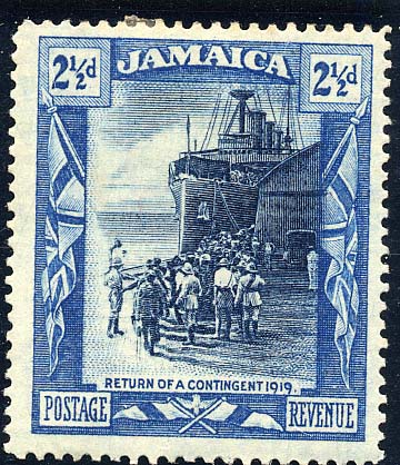 At first glance there would appear to be nothing unusual about the design of this rather attractive stamp. To the naval man it must have been something of a puzzle. He would wonder how a cruiser could find accommodation for a contingent of troops, and why such a vessel would be employed trooping. For that is what seems to be happening in the picture on the stamp. The explanation is simple. Actually, the appearance of the cruiser on the stamp is incidental, for the British West Indies contingent returned by transport and not by warship. The troops disembarked and had to pass the cruiser on their way to the demobilisation camp. While passing the warship the photograph was taken from which the stamp is reproduced.