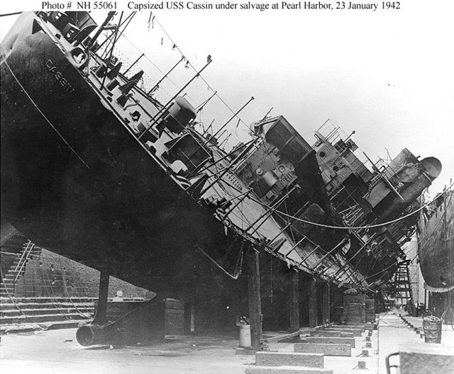 CASSIN was in drydock with DOWNES (DD-375) and PENNSYLVANIA (BB-35) at Pearl Harbor on 7 December 1941. In the Japanese attack, an incendiary bomb exploded DOWNES fuel tanks, causing uncontrollable fires on board both DOWNES and CASSIN. CASSIN slipped from her keel blocks and rested against DOWNES. Both ships were considered lost, and CASSIN was decommissioned as of 7 December1941. However, superb salvage saved CASSIN,to play an outstanding role in World War II, and she was towed to Mare Island Navy Yard for rebuilding. Recommisisoned 6 February 1944, CASSIN reported at Pearl Harbor 22 April, and was assigned escort duty from Majuro until August. By shooting out caves and bombarding Aguijan Island, she aided in the consolidation of Tinian from 15 to 25 August, and then assumed escort duties out of Saipan Her guns took revenge on the Japanese once more when she took part in the bombardment of Marcus Island on 9 October. This was part of the preparations for the Leyte assault, and was an attempt to convince the Japanese that the main attack they sensed was coming would be directed at the Bonins. With the same force which had struck at Marcus, CASSIN sailed on to join TG 38.1 on 16 October, as the carriers of that group prepared the air strikes designed to neutralize the Japanese airfields in the Manila area prior to the assault landings on Leyte. CASSIN steamed northeast of Luzon during the Leyte landings, and when the landings had been successfully launched, was dispatched with her group to refuel and replenish at Ulithi. However, when TF 38 made contact with the Japanese Center Force rounding the southern cape of Mindoro bound for its part in the decisive Battle for Leyte Gulf, CASSIN‘s group was recalled to join the approaching action. In the afternoon of 26 October, her group at last reached position to launch aircraft which attacked the Japanese ships in one of the longest-range carrier strikes of the war. These strikes continued as the Japanese fleet retired north, diminished and battered.