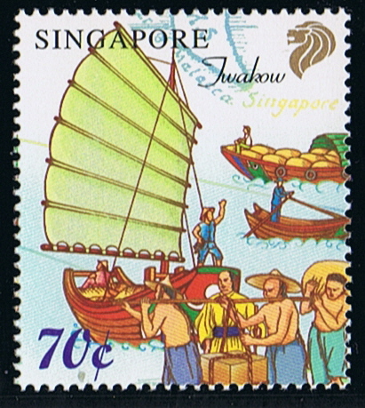 The 70c depict the Twakow or sailing lighter, she was a locally built craft designed by the Chinese. It carried cargoes mainly from the Malay Peninsula. It was also used to convey cargoes from large ships at the anchorages to many warehouses on the banks of Singapore and Kallang rivers. The Twakows subsequently lost their masts and sails after bridges were built across the rivers. Also featured on the stamp design is the Sampan Kotak, a flat-bottomed boat mostly used for ferrying passengers.