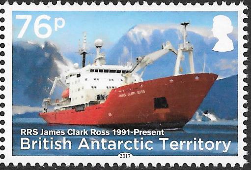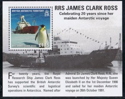 Named after Admiral Sir James Clark Ross, R.N., the RRS James Clark Ross was launched by Her Majesty Queen Elizabeth II on 1st December 1990 and sailed for her maiden Antarctic voyage on 26th October 1991. In the first stamp depicting the vessel alone, she is shown leaving Rothera Research Station in January 1998; in the second, she is on her first call to Signy Research Station, the UK’s summer-only facility in the South Shetland Islands, in 2007.