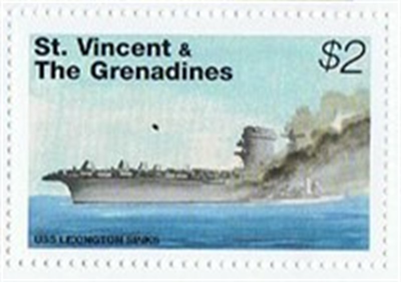 Originally the Lexington was designed as a battle cruiser and was to have had seven funnels, but when it was decided to alter her to an aircraft carrier during construction, the seven funnel uptakes were trucked together in one gigantic funnel casing. As the ship's bridge and control tops would have become almost untenable because of the heat from the equivalent of seven funnels in one, the bridge and control structure were separated. This is quite clearly shown on the stamp, and there is no doubt in my mind that the U.S.S. Lexington is the carrier depicted. To American Naval personnel the ship was affectionately known as "Lady Lex". Commanded by Capt. Frederick C. Sherman, she was known as a happy ship throughout the U.S. Navy, many of her crew having served in her since she was commissioned in 1927, In the Battle of the Coral Sea, she was flagship of Task Force No. II, with Rear-Admiral Aubrey W. Fitch on the bridge. On May 7, aircraft from the task force sank the Japanese carrier Shoho. She was smothered by 13 bomb and seven torpedo hits and sank within half-an-hour of the first attack, three carrier plane group attacks being made on her, with the loss of six U.S. Navy aircraft. The following day, May 8, at about 8.15 a.m., American aircraft located the Japanese carriers Shokaku and Zuikako, Japanese aircraft at the same time locating the American carriers Lexington and Saratoga.