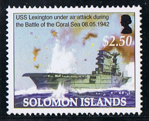 Four special commemoratives for the 25th anniversary of the war in the Pacific were issued by the Territory of Papua and New Guinea on August 30, 1967. The 50 cents stamp, designed by Mr. G. Wade, depicts his impression of an action in the Battle of the Coral Sea. It seems to me that the stamp designer has depicted an attack on the U.S.S. Lexington and the silhouette shows her huge funnel.