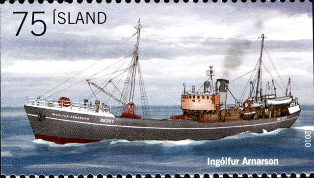 A modem post-war steam trawler, the Ingolfur Arnarson, named after the first settler in Iceland (AD. 874), appears on 10 aurar and 1.50 krona stamps of Iceland. She is owned by the Reykjavik City authorities and is one of 32 of the same type built in England, another 10 being under construction when the stamp was issued. The vessels are 175ft long with gross tonnages varying between 600 and 700.