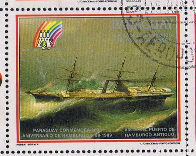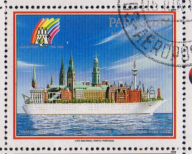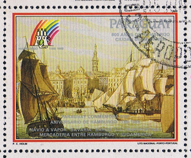 The vessel depict on this label of Paraguay, for the 800 year Commemoration of Hamburg is most probably the BAVARIA of the Hamburg America Line, but she has five sisters so it can be also a other ship of that class, can not find the painting on line after which this design is made.