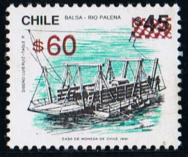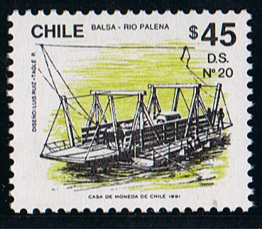 The inscription on the stamp gives; “Balsa Rio Palena” Balsa translated means in English raft, the ferry depict on this stamp loosely applied to a float or raft constructed from logs and drums hold together by a framework.