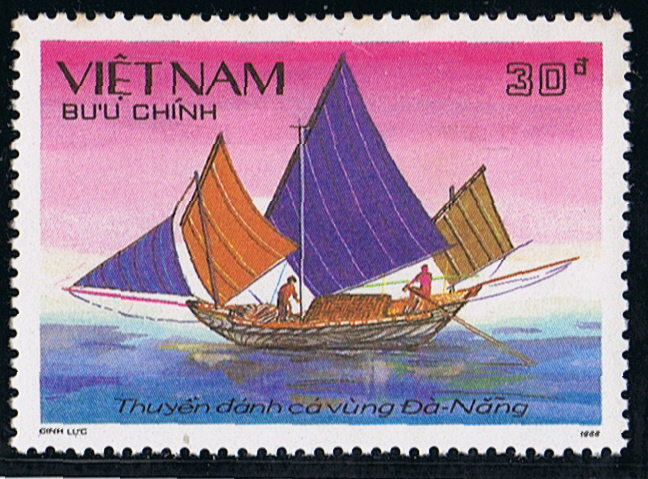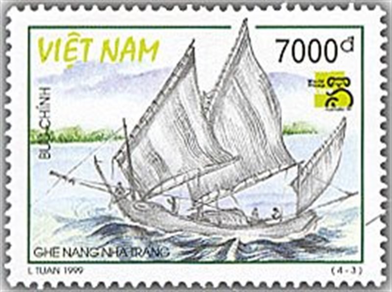 The stamp shows use a GHE NANG with three masts which sets lugsails made of woven fibre or cloth and on the bowsprit during light winds a jib.