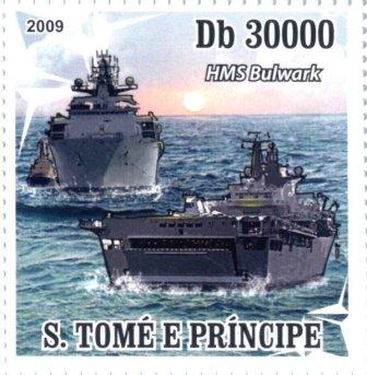 In 2009 a set of stamps were issued, under the guise of S Tome, to commemorate the 60th anniversary of NATO. One stamp shows two views of HMS BULWARK – the upper view shows an ADEPT class tug on the starboard side of the vessel.