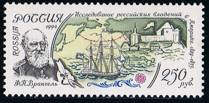 A portrait of a Russian admiral and the honorary member of the Petersburg Academy of sciences F.P. Vrangel (1796/97 - 1870), the main governor of the Russian possessions in America. The researches of 1829 -1835 were carried out under his guidance. F.P.Vrangel was the author of works on travelling in northern part Siberia, on the navigation in the Northern Ocean and about peoples of northwest America. The stamp also features a geographic map of Kamchatka and Alaska, the route of the expedition in North America, the ship "Krotkiy" and Novo-Archangelsk (the centre of the Russian possessions in America).
