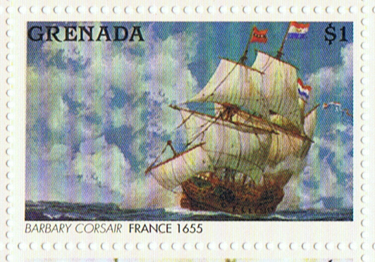 The stamp gives that the vessel depict on this stamp is a Barbary Corsair from France of 1655.