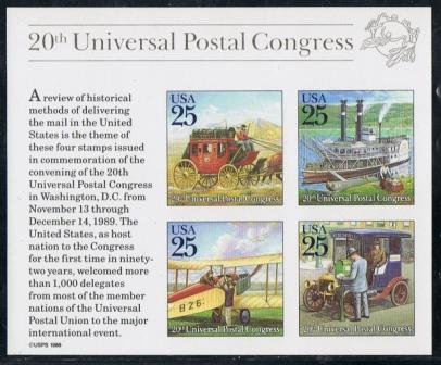 The United States Postal Service issued a set of four 25c stamps and an imperforate miniature sheet on 19 November and 27 November 1989 respectively to honor the 20th Universal Postal Congress held in Washington, DC from 13 November to 15 December 1989.