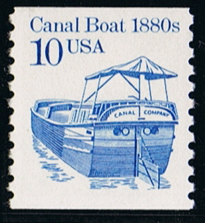 The 10c coil stamp issued by the U.S. Postal Service on 11 April 1987 depicts a canal boat of the type used to transport passengers and freight on the American canals in the 19th century.