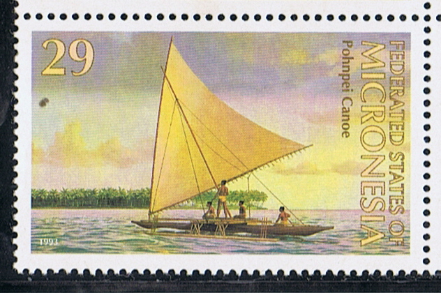 Most of the outrigger canoes used at Pohnpei and nearby islands was of the “wa” type, she was made from a dugout hull, rounded in cross sections. Flat bottom amidships rising to overhanging, pointed ends sharp at cutwater. Multiple thwarts; small platform amidships rested on outrigger booms.