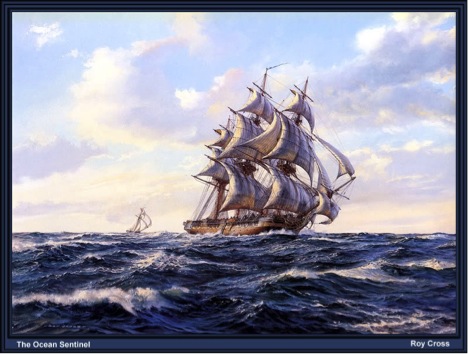 The stamp 600FG depicts copy of the painting Roy Cross: « The Ocean Sentinel» 'A fine naval frigate drives along before the wind in the glow from the setting sun, accompanied by a small cutter as her tender.' Additional information about the ship, is welcome.