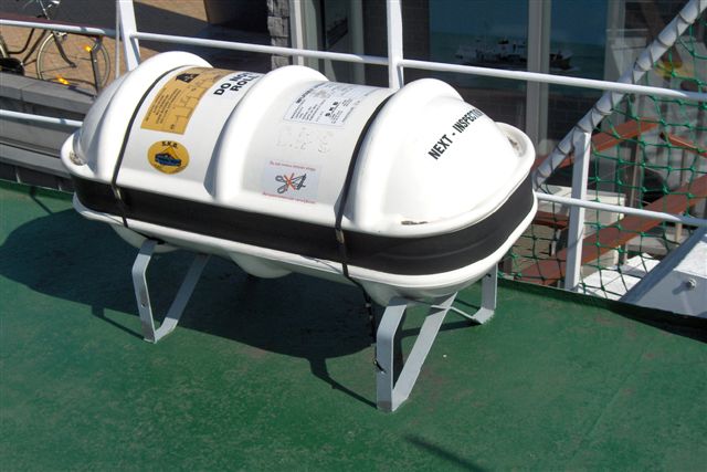 When carried on a ship she is packed in the canister as seen on the photo, when the ship is going down the raft breaks free of the canister and the raft inflates automatically.