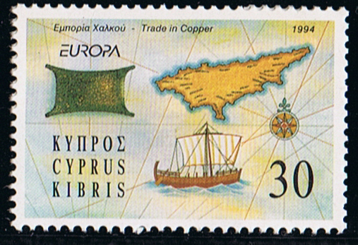 The 30c stamp of Cyprus of the Europe series shows an ancient sailing vessel most probably used in the copper trade from Cyprus, a map of Cyprus and a copper ingot as produced in ancient times.