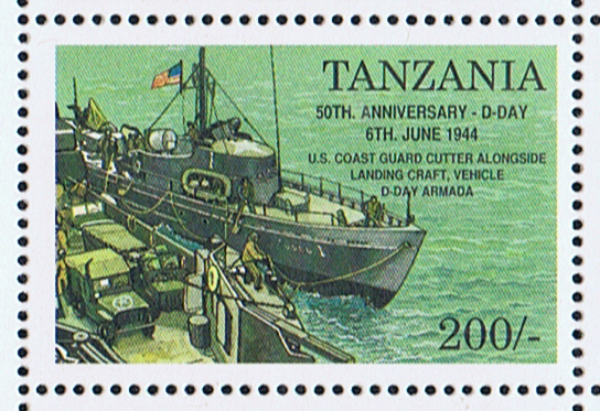 The stamp is designed after a photo, which depict the Coast Guard vessel USCG 1 and the Landing Craft Personnel Vehicle (LCVP) 549 tied up alongside the troopship SAMUEL CHASE which is not visible on the stamp.