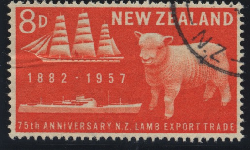 This stamp depicting a Shaw Savill & Albion vessel was issued in 1940 by the New Zealand post office and features the full-rigged ship Dunedin. In 1882, by the introduction of refrigerating machinery on board the vessel, she laid the foundation of the frozen meat industry between New Zealand and this country. She was chartered by the New Zealand and Australian Land Co., Ltd., who, in co-operation with the Albion Line, had the ship fitted with a Bel-Coleman cold air freezer. In the following year the Dunedin was taken over by the Shaw Savill Line when they purchased the Albion Line. For nine consecutive trips the ship was chartered to carry frozen meat cargoes.