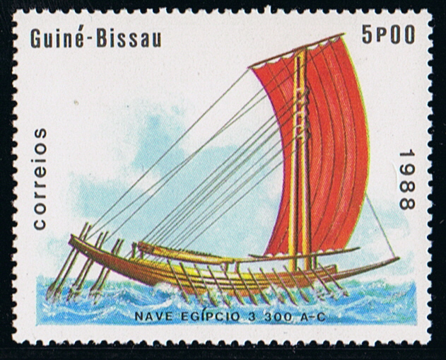 The inscription on the stamp gives that an Egyptian ship of 3300 B.C is depict, but the ship on the stamp is of much later date, the bipod mast came not in use before 2700 B.C.