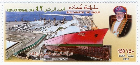 Oman 2012 150b sg?, scott? (In the background the two ships in dock are the same as one the 50 B stamp)