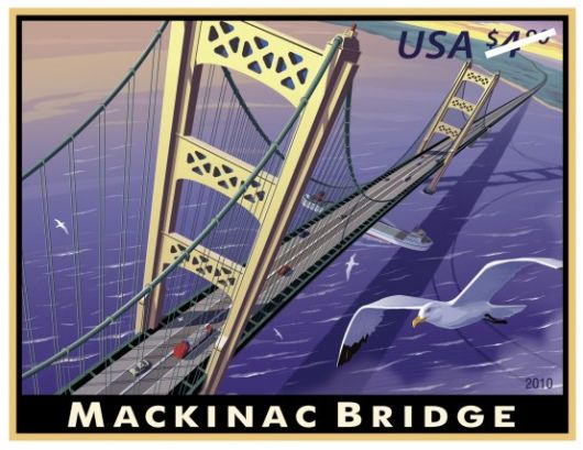 Completed in 1957, the Mackinac Straits Bridge is featured on U.S. #1109. It connects the Upper and Lower Michigan peninsulas. The bridge is an engineering marvel that runs for seven miles across the Straits. In 2010, the Mackinac Straits Bridge was also pictured on U.S. #4438.