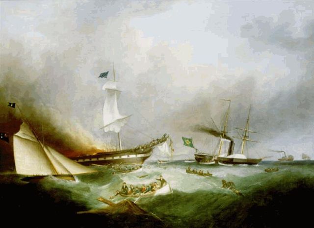 Two other vessels in the area, came immediately to the ships aid, they were the yacht QUEEN OF THE OCEAN, captained by Mr. Thomas Littledale; and the Brazilian frigate DOM AFONSO, captained by J.M. Lisboa. Onboard the DOM AFONSO was Admiral John Pascoe Grenfell who was superintending the trial of the frigate, he would later man a boat as part of the rescue. Later on two other vessels would join, what quickly became a sea rescue, they were an American packet NEW WORLD and the railway steamer PRINCE OF WALES. These rescuing vessels launched boats to aid the collection of the survivors. The DOM AFONSO managed to get close enough to the OCEAN MONARCH to fasten a rope to her allowing for rapid ferrying of passengers via boats.