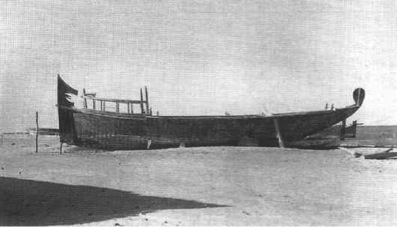 A dhow even more strange to the European than the bedan, and which is no longer in existence, was the batil. It was easily identified by the prominent oval stemhead and peculiar sternpost projections. The latter faced in a forward direction and looked very much like the stylised head of an animal. There was some chiselled ornamentation, more particularly at the edges of the projections. Prior to their demise in the 2nd half of the 20th century, they were mainly pearling vessels. Common to both batil and bedan is the broken or angled keel, the aftermost length sloping up to and extending beyond the sternpost to give partial support to the after timbering. Кeel on some roughly one-third the length of the vessel. Rudder hung below and under the keel; worked with lines that ran from the quarters to a short spar affixed to the outer edge of the rudder just above the waterline; tall rudderhead. Decked at ends, larger sizes fully decked;ribs at waist extended above the top strake. Hull oiled and varnished; stylized decorations at bow and stern. Small types hoisted a single quadrilateral lateen-type sail with a short luff to a forward-raking mast; larger vessels, especially of the Iranian coast also had a similar but smaller mizzen. In calms, propelled by sweeps. Crew of 10-20, to 30-45 when pearling. Reported lengths 14.6-23m, widths 2.8-4,9m, depths 1.2-2.lm.