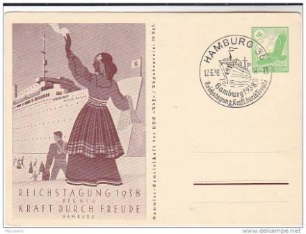 A German war loss, the Wilhelm Gustoff is shown cruising off Madeira on a 6 + 4 pf issue in aid of the German Winter Help Fund in 1937. This vessel was built by Blohm and Voss at Hamburg for the "Kraft Durch Fraude" ("Strength through Joy ") movement, a department of the Ger¬man Government's Labour Ministry, concerned exclusively with recreation and holidays for German workers.