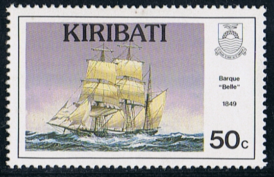 Pre-eminent among the early whaler-traders in the Gilberts (Gilbert and Ellice Islands, now Kiribati) was Captain Ichabod Handy of Fairhaven, Massachusetts, master and principal owner of the barque BELLE, who commenced oil trading at Abaiang in 1849 (year on stamp). In 1855 he went on to pioneer the coconut oil trade in the neighbouring Marshall Islands.