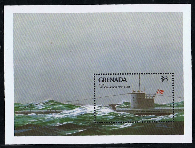 ATHENIA. Passenqer. Built by Fairfield Shipbuilding & Engineering Co. Govan. Launched 1923. Built for Anchor Donaldson Ltd. L526'3" B66'4" Dr38'1". 13,581tons. Double reduction steam turbines. 2 screws. 15 knots. Passengers 516 Cabin, 1,000 third class. (later 314 cabin, 310 tourist and 928 third class) Anchor-Donaldson became Donaldson Atlantic Line in 1935. She was the first Passenger ship sunk in WW2 (on the opening day of the war), shown on the stamp presumably with Submarine U-30 which sank her. Sailing from Glasgow, about noon for Montreal on 1 Sept. 1939 commanded by Capt. James Cook, calling at Liverpool and Belfast to embark Passengers, 1418 persons were on board, 1103 were Passengers, and 311 were Americans. On the evening of the 3rd, 250 miles west of Inishtrahull, Donegal she was torpedoed. War with Germany had broken out only a few hours before. Soon after the explosion the Submarine surfaced and from 800 to 1000 yards fired two shells in order to silence the radio. By this time the ship had taken on a list making it difficult to lower the boats. Some days later after the survivors had landed Donaldson Line announced that 128 persons had lost their lives. It was reported that Lt Commander Lemp torpedoed the ship without giving any warning. The U-30 was one of a number of German Submarines which were scuttled in Flensburger Fjord on 4-5th May 1945. Doubt has arisen that the vessel depicted in the background of this sheet is a correct identification. Two funnels can be seen whereas the ATHENIA only had one. Two books confirm that ATHENIA had one funnel, The Atlantic Liners 1925- 1970 by F Emmons and Great Passenger Ships of the World, Vol 2 by Arnold Kludas - Grenada 1990. $6 SG2119 Min. Sheet (P Snijers E J Hogan)