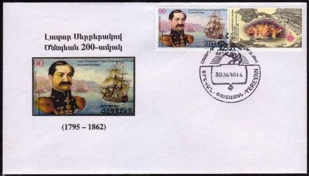 Lazar Serebryakov (Ghazar Artsatagortsian) by his birth name), born in 1795 was a Russian Navy Admiral of Armenian descent. He participated in the Russo-Turkish War, 1828-1829, serving in the Black Sea and Baltic fleets, commanding battleships. In 1838, he laid the foundation of the city of Novorossiysk. He also held top command positions during the Crimean war (1853-1856). He died in 1862.