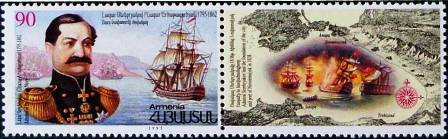 The stamp and label of Armenia were issued for the 200th Anniversary of Admiral Lazar Serebryakov birth, and shows us a portrait of the Admiral with in the background and most probably a Russian warship not a name given, the only warship what I could find with a connection to the admiral was the POLTAVA launched in 1829, which he commanded from 1835 until 1836. If she is depict I am not sure?. On the label is a scene of a 19th century sea battle with a map of the Black Sea. Not given when this battle took place.