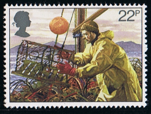 The 22p depicts a lobster fishing vessel. Pots baited with fresh dead fish are set on the sea bed, in fleets of 20 to 70 pots each. They are fastened at intervals along a rope anchored to buoys. The pots are left overnight and usually hauled in within 24 hours.