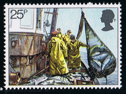 The 25p depicts the use of a seine net for catching surface schooling fish such as mackerel and herring. A seine is a long curtain of netting with a series of rings on its lower side through which a wire is passed. The net is laid to surround the fish which are located by echo sounder. They are trapped by pulling the wire to form a purse. They are trapped by pulling the wire to form a purse. They are then transferred to the ship by a smaller net or brail.