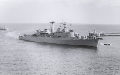 HMS Hampshire D-06 County-class destroyer of the Royal Navy. Laid down, in March 1959 a couple of weeks behind the class leader Devonshire, she was classified as a Guided Missile destroyer, as the Sea Lords regarded the concept of the Cruiser and big gun ship as discredited by the perceived failure of the Tiger class and the obsolescence of the heavy gun. The description of Guided Missile Destroyer seemed more likely to win approval from the Treasury and Government for an adequate number of warships the size of small cruisers which could play many traditional cruiser flagship and command functions but had armour around neither its gun or missile magazine. In the late 1960's there were plans to upgrade Hampshire and sister destroyers armed with Seaslug Mk 1 but this was rejected because of the amount of the time the ships would be out of the operational fleet. She was decommissioned in 1976 at a time the Labour Government was making severe defence cuts under pressure from the IMF. and cannibalised for spares to service her sister ships. Hampshire was sold for scrap in 1979.