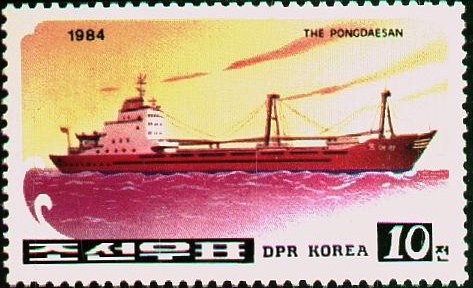 Given by Stanley Gibbons as PONGDAESAN, not a North Korean ship exist with this name, but after some searching and comparing the ship on the photo with the stamp I believe the BONG DAE SAN is depict.