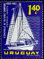 In 1963 the Uruguayan Post Office issued a set of four stamps to honour the world cruise of the small schooner Alferez Campora which voyaged around the world for 341/2 months and received a rousing welcome home from the Uruguayan people. The schooner was built in 1934 at Amsterdam and was originally owned in Holland under the name of Microcosmos, but subsequently she was sold to Mr. Hugo Stunz, an Argentinian engineer, who renamed her Acherra. In December 1939 when the German warship Admiral Graf Spee had taken refuge in the harbour of Monte Video, the Acherra was lying at Punta de Este. A number of British citizens residing in Monte Video hired the vessel privately, ostensibly for a fishing expedition; she sailed from Bueco, Monte Video, with her British crew, proceeding to fish in waters where a watch could be kept on the Monte Video channel in order to radio a warning to the British naval forces that the Admiral Graf Spee was on her way out.