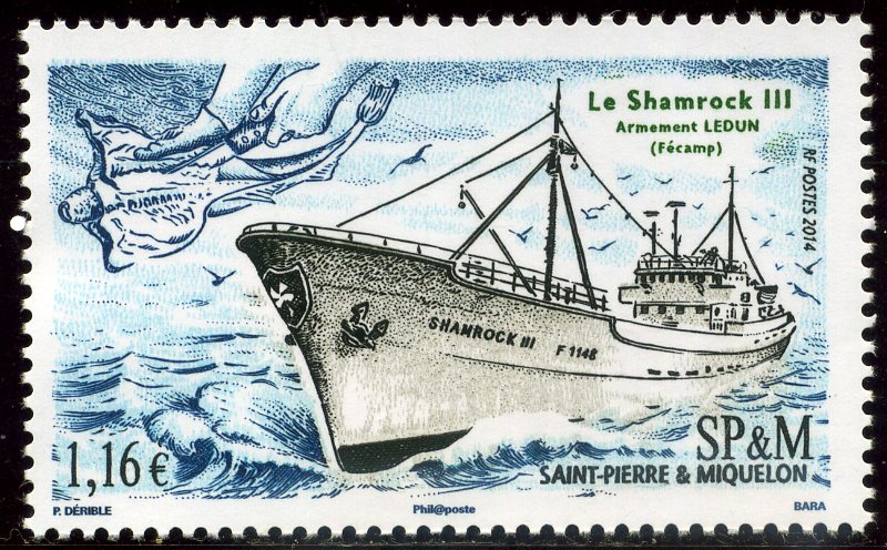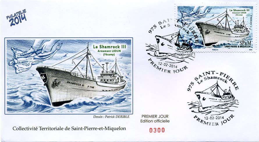 On 12 February St Pierre et Miquelon issued a stamp in the trawlers series, this stamp shows the SHAMROCK III one of the last French traditional trawlers fishing in the waters of St Pierre.