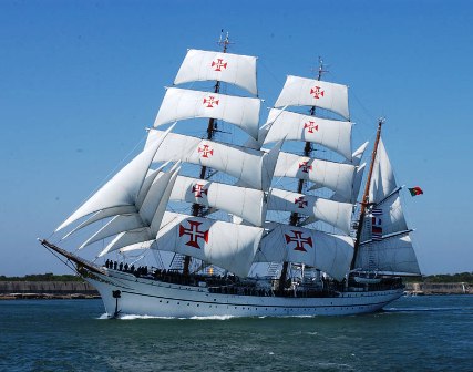 The Sagres was built in 1937 in shipyard of Blohm & Voss in Hamburg and named the Albert Leo Schlageter. She was the 3rd of four ships built by the German Navy including the Horst Vessel (now the US Coast Guard ship, Eagle). and the Gorch Fock (now the Tovarishch of Ukraine). A sister-ship, Mircea, was also built for the Romanian Navy. During World War II she was taken to Bremerhaven shipyard after damage from a mine and captured by the U.S. forces in 1945. The ship was given to Brazil in 1948 and sailed in as a training ship in the Brazilian Navy under the name Guanabara. In 1962 she was purchased by Portugal purchased to replace the old sail training ship Sagres and is often referred to as the Sagres II.